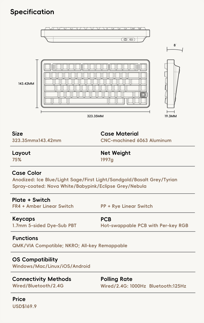 Today, we're thrilled to present our brand's second product: Evo75. Like its predecessor, Evo75 is a pre-assembled custom mechanical keyboard. The 75% layout strikes that perfect sweet spot—preserving nearly all the keys you need while minimizing the space it takes. It's the ideal harmony between full functionality and smart space optimization."